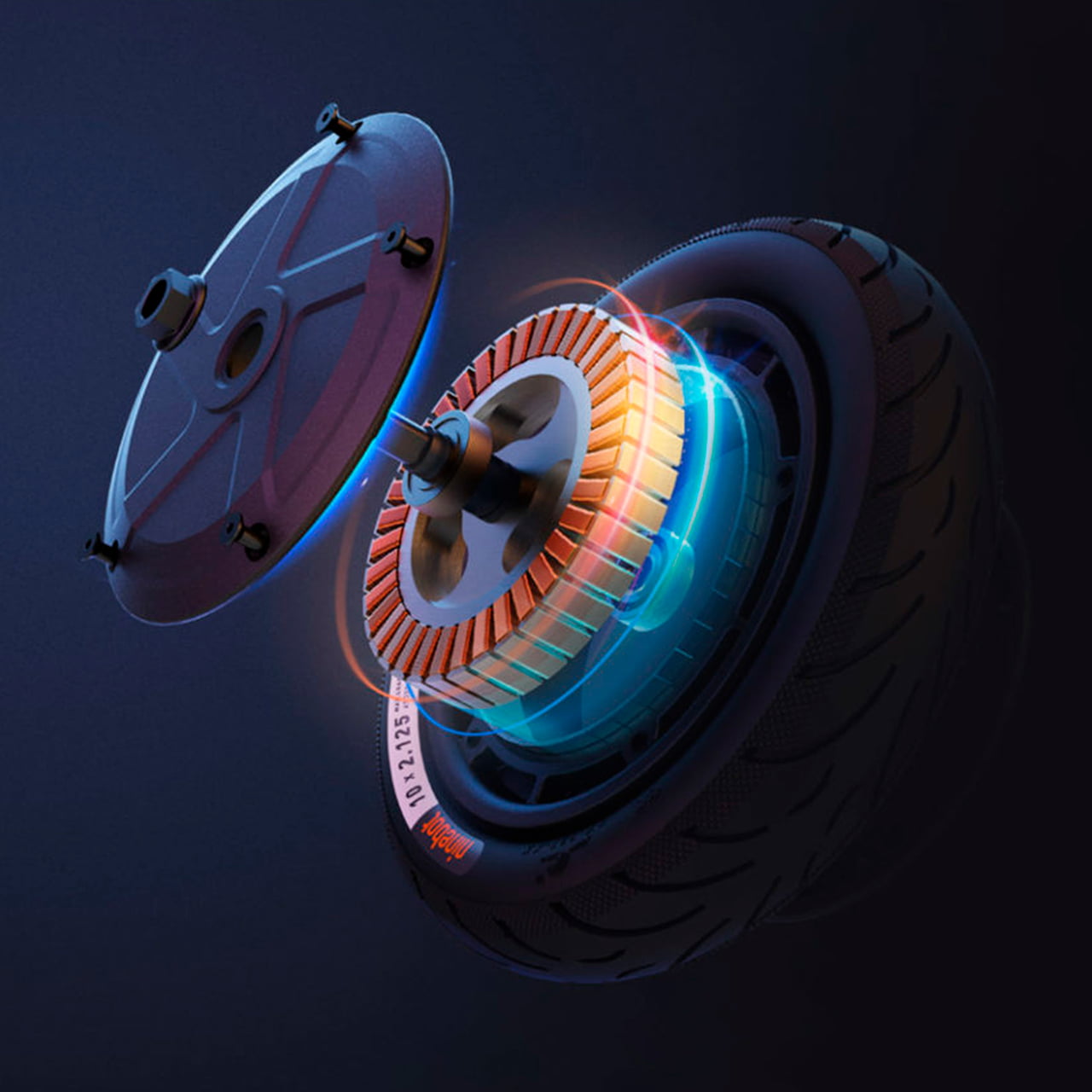 Переднее колесо самоката оборудовано электронным тормозом с E-ABS, а на заднем установлен классический барабанный механизм торможения. Благодаря такому гибриду обеспечивается быстрая, но плавная и безопасная остановка.
